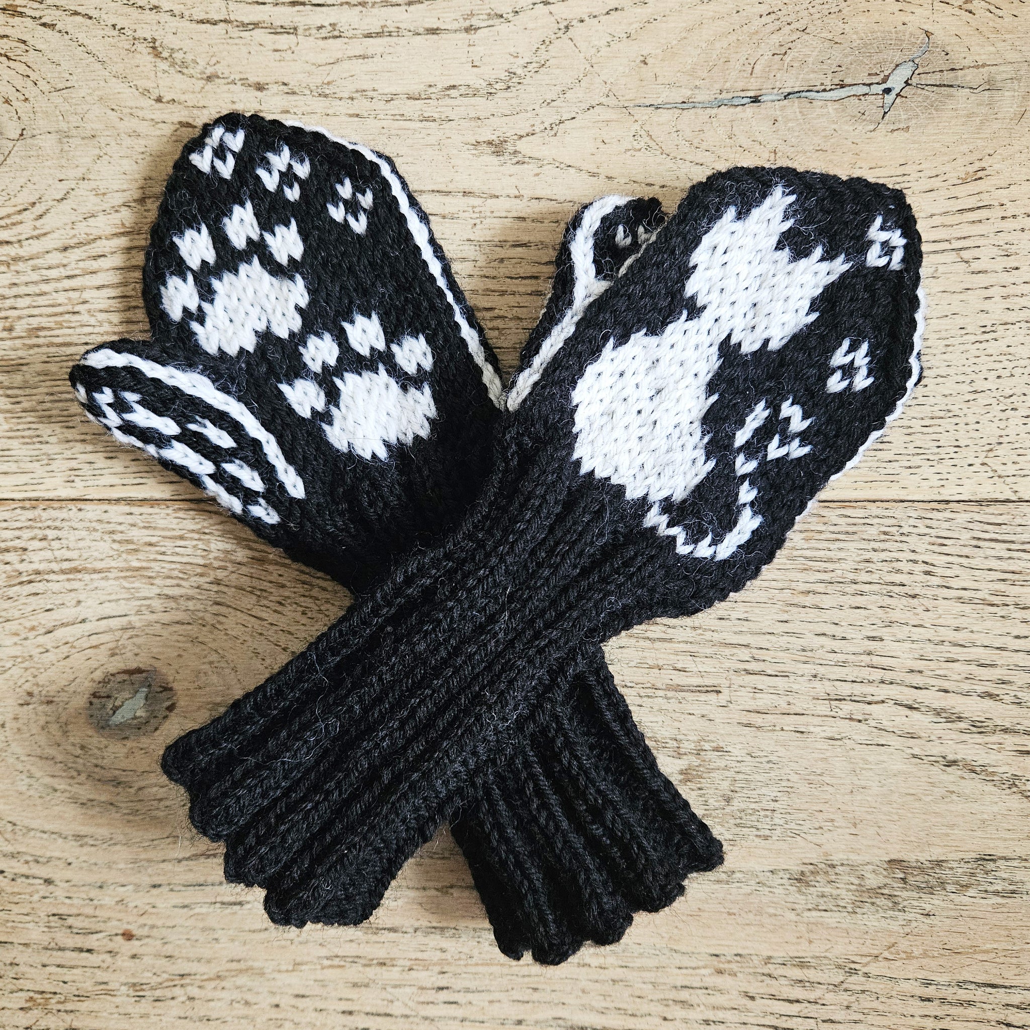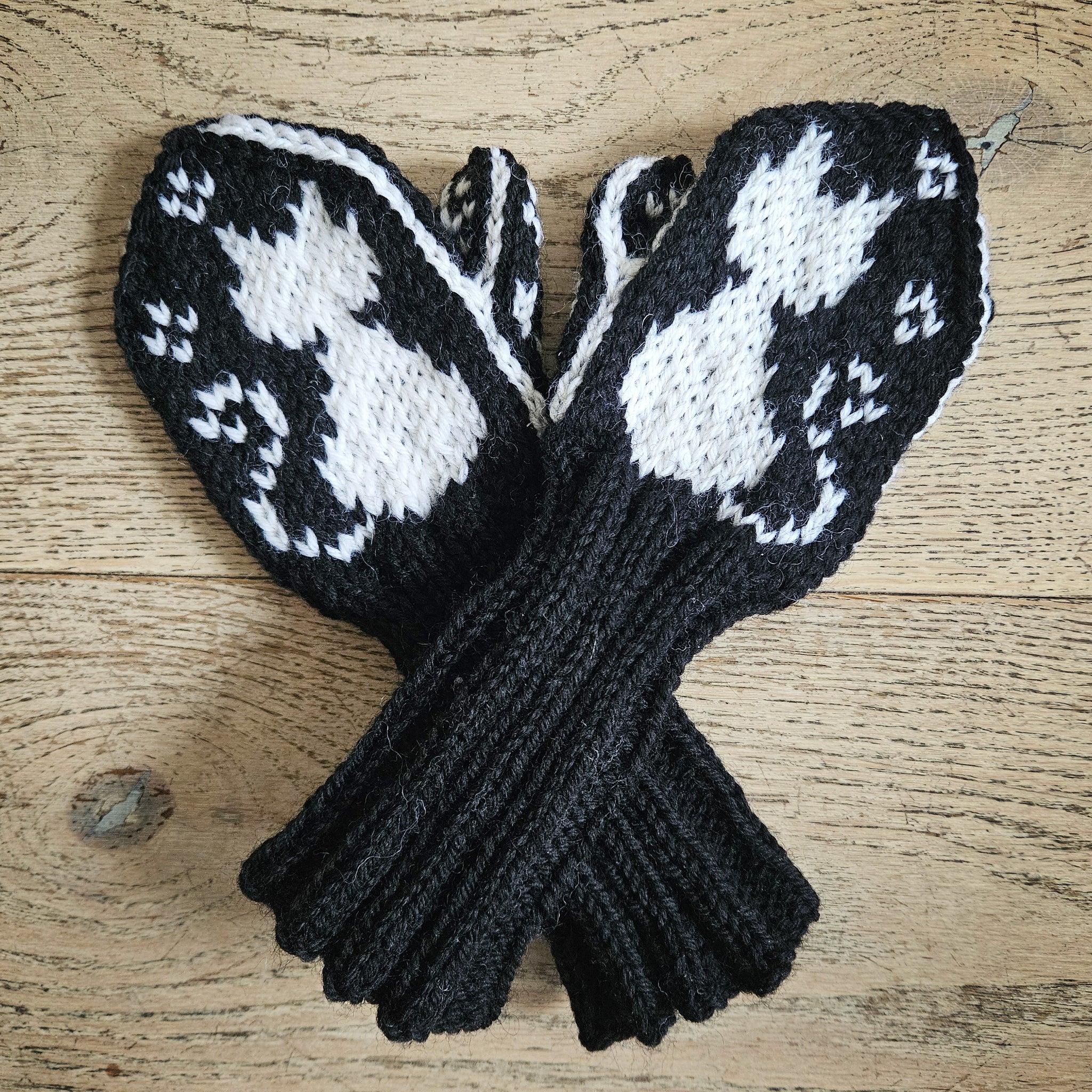 Strikkeoppskrift på barnevotter med kattemønster til barn i barnehagealder.