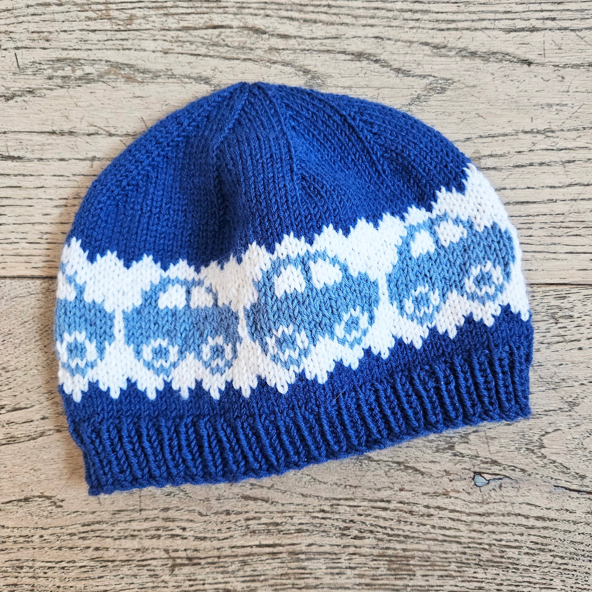 Bilturlue er en strikkeoppskrift på lue med bilmønster til barn og voksen.