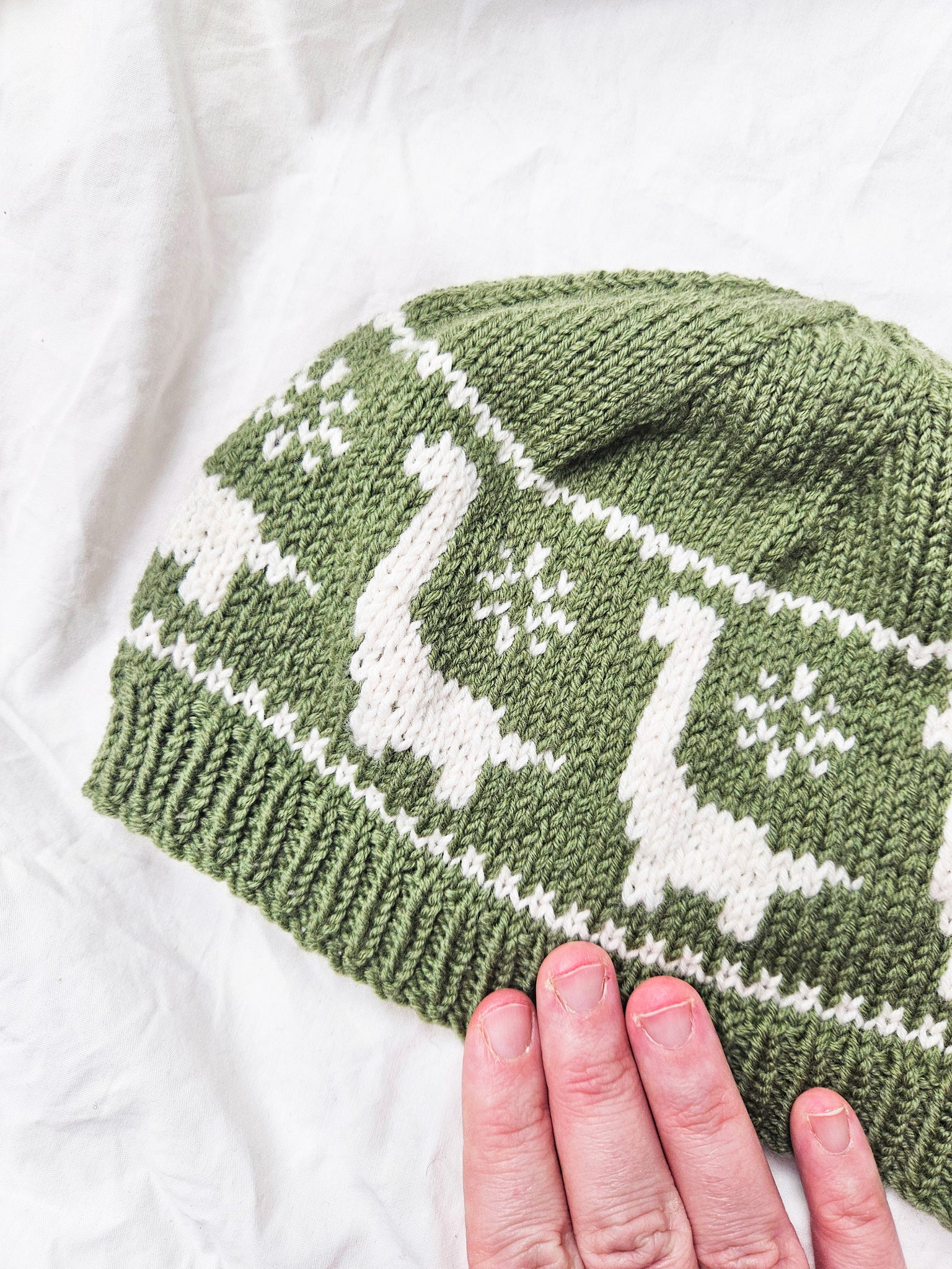 Den grønne lua på bildene er størrelse 3-5 år og er strikket i Sandnes Sunday, dobbel tråd.